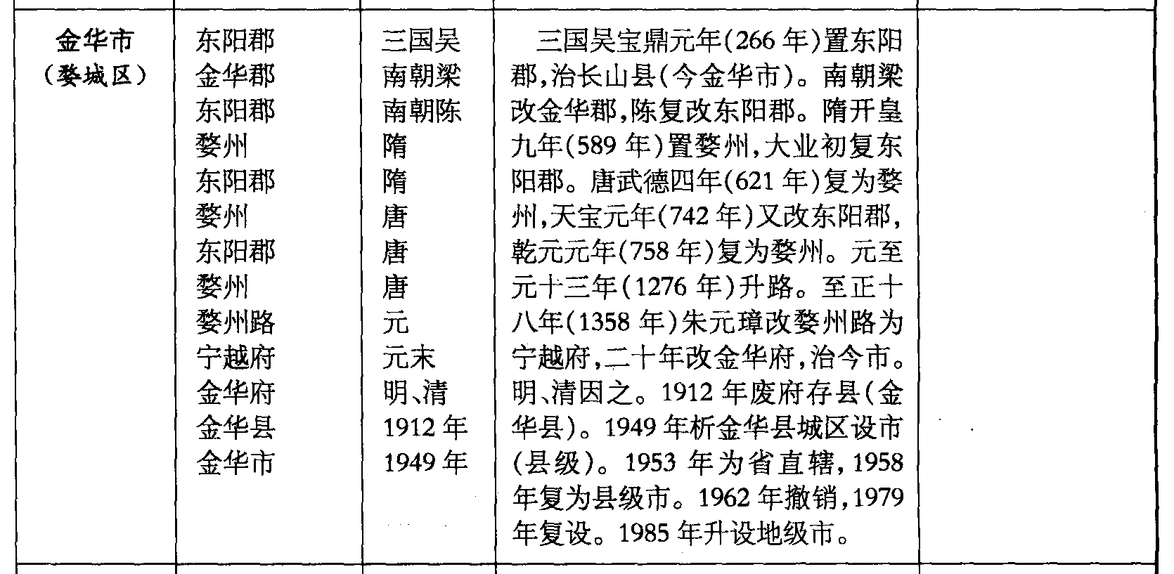 三国吴宝鼎元年(266年)置东阳郡,治长山县(今金华市)。南朝梁改金华郡,陈复改东阳郡。隋开皇九年(589年)置婺州,大业初复东阳郡。唐武德四年(621年)复为婺州,天宝元年(742年)又改东阳郡,乾元元年(758年)复为婺州。元至元十三年(1276年)升路。至正十八年(1358年)朱元璋改婺州路为宁越府,二十年改金华府,治今市。明、清因之。1912年废府存县(金华县)。1949年析金华县城区设市(县级)。1953年为省直辖,1958年复为县级市。1962年撤销,1979年复设。1985年升设地级市。