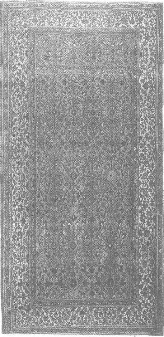 清。纵321厘米,横163.5厘米。北京故宫博物院藏。此地毯是新疆地方向清宫廷敬献的宝物,曾经在皇帝专为皇太后的生日举行祝寿庆典的慈宁宫使用过。毯心在金地上用紫红色丝绒线编织成新疆传统的花卉图案组成的四合形几何连续纹样,内缀富有装饰性的彩色花卉。地毯花边由外至内分四道组成,第一道蓝色素边,第二道朱红串枝花珠纹,第三道金地花卉纹,第四道木红串枝花珠纹。底径用丝线,底纬用棉线,以三股加捻的圆金线和两股加捻的圆银线横向编织人字纹。栽绒拴“8”字扣,每过三道底纬拴扣一排,每平方厘米纵向织五扣,横向五扣。配色以赤金和紫红两色为全毯的主要色调,再配以明黄、橘黄、深蓝、月白、深绿、浅绿等明快色彩的丝线。此毯图样严谨,花纹丰满,配色鲜明,编织细密,起绒短而匀整平滑,质地牢固,耐磨力强,是清代新疆地毯的珍品。