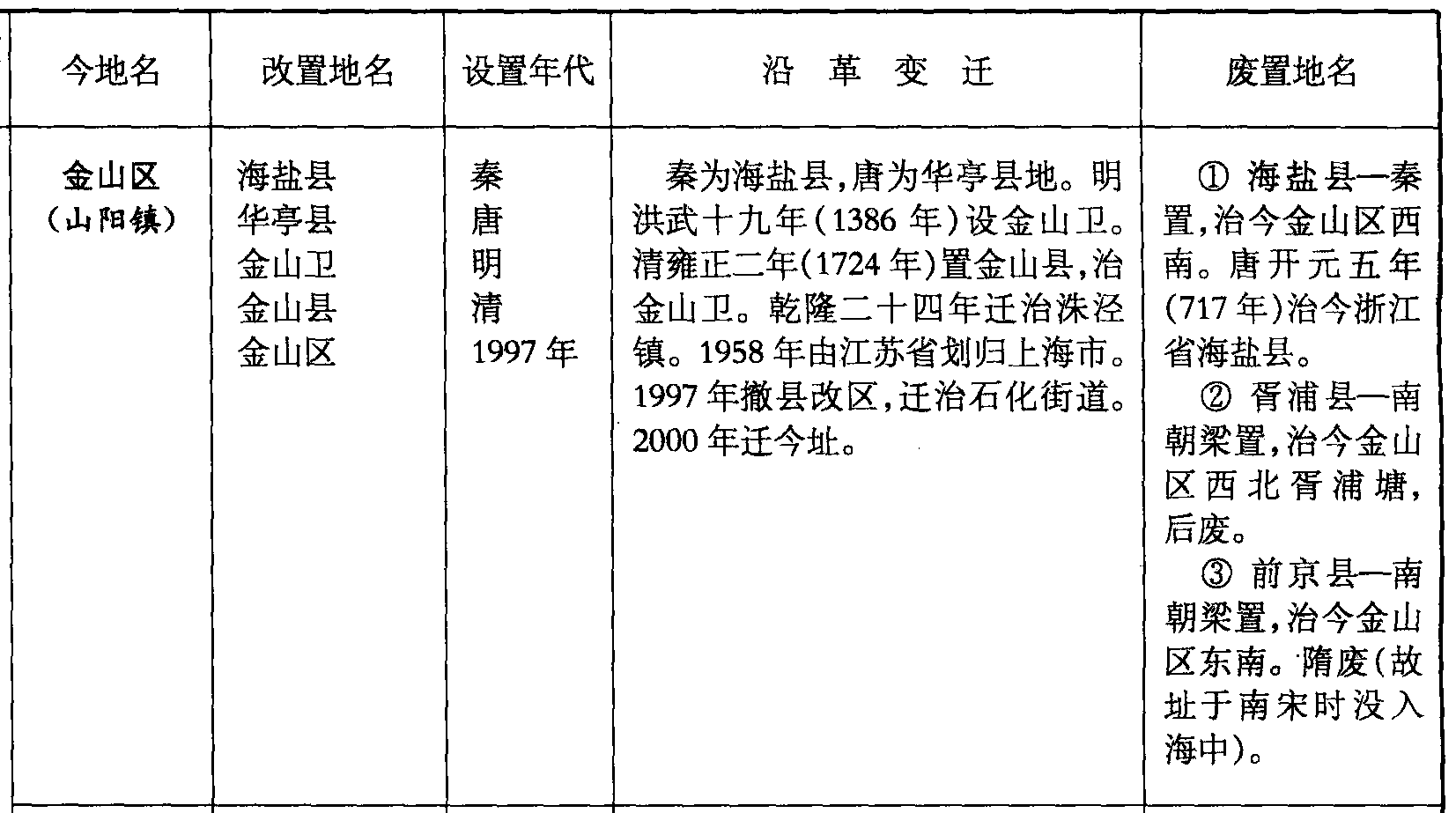 ❸ 前京县—南朝梁置,治今金山区东南。隋废(故址于南宋时没入海中)。
