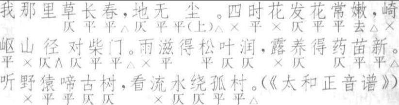 全曲八句:3△,3△。7△,7△。5,5△。5,5△。首二句须对。第四句第四字常用暗韵,如马致远所作七剧,共用〔金盏儿〕十四支,半数是有用藏韵的。此句不论有无藏韵,皆可破为两句,如乔吉《金钱记》“似轴美人图画,画出来怎如他”;又可破为三字二句,如关汉卿《金线池》“他可早耳朵闭,眼睛花”;甚至多加衬字成为两个长句,如马致远《荐福碑》“ 一个个拴缚纸毽子,一个个装画闷葫芦”。第五、六句及第七、八句皆须作对语,实是五言律,少有不对者。一套可用两三支,或两支连用,或与他曲间用。一名〔醉金盏〕。与〔双调·金盏子〕不同。与南曲不同。〔高过金盏儿〕及〔低过金盏儿〕,只前数句相同,后半曲则大异,此不具论。