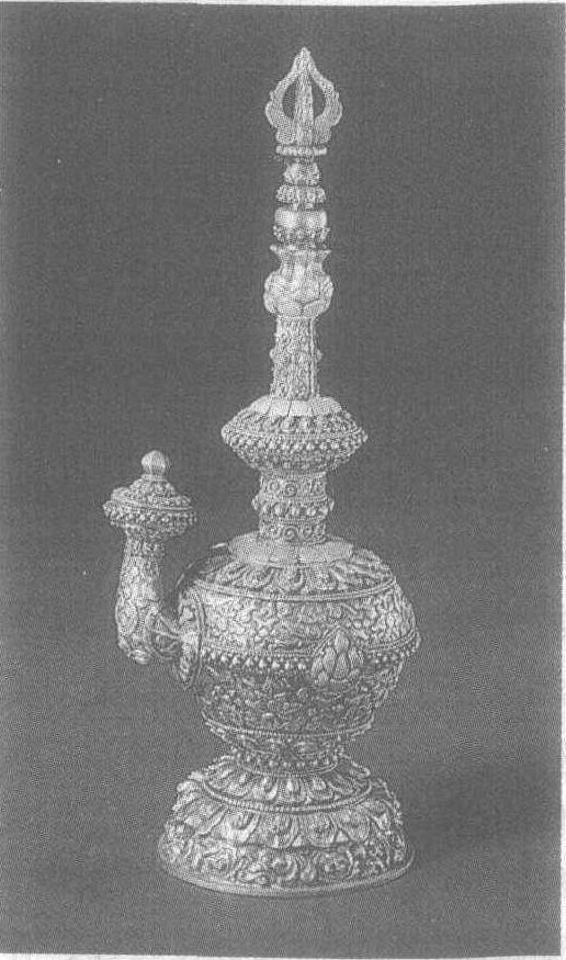 | 释义 | 金錾花嵌松石贲靶壶 金錾花嵌松石贲靶壶清。高18.4厘米,腹径5.5厘米,足径5.8厘米。北京故宫博物院藏。金贲靶壶是藏传佛教的法器之一,原供奉在故宫的养心殿内。凡是皇帝住的地方多设有佛楼、佛堂等,以祈永福。这件金贲靶壶造型奇特,通身錾花并嵌绿松石,是西藏法器中的精品。