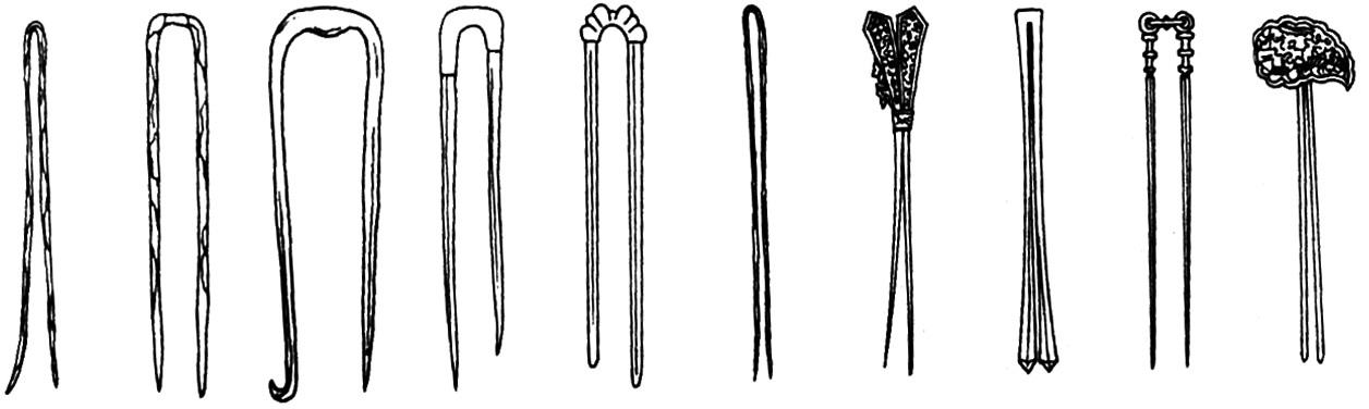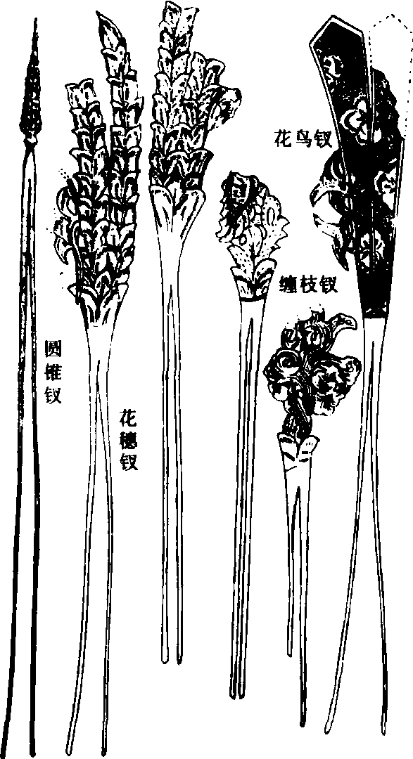 钗形制的演变 钗 钗古代妇女的一种首饰。钗是簪的一种形式,簪为一股,而钗则为双股,其头上为花卉、禽鸟、走兽等饰物,十分美观、精致。其质地多为金、银,是一种当时较为贵重的首饰。古代的诗词歌赋中有不少关于钗的描绘与咏叹,其中南北朝的《玉篇》中写道:“钗,妇人歧笄也。”司马相如在《美人赋》中写道:“玉钗挂臣冠。”