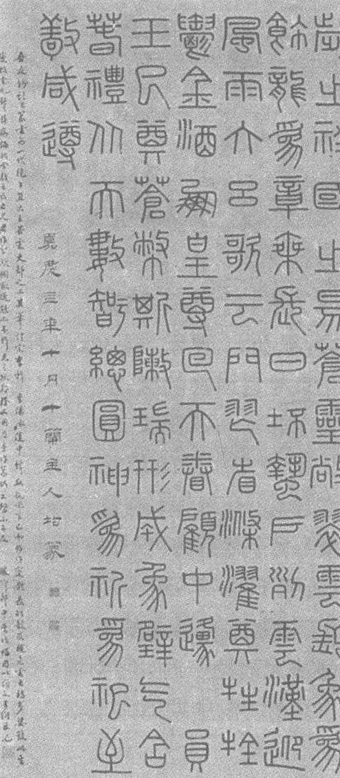 | 释义 | 钱坫篆书文摘轴 钱坫篆书文摘轴清。纸本。纵125厘米,横57.4厘米。北京故宫博物院藏。钱坫(清乾隆九年—清嘉庆十一年,即公元1744—1806年),字献之,号十兰,江苏嘉定(今属上海市)人。乾隆三十九年(公元1774年)副榜。累官知乾州,兼署武功县。工小篆,直接李阳冰、徐铉。晚年右体偏枯,左手作篆尤精绝,名动当代。擅铁笔。工墨梅,精通文字及考据之学,有多种著作传世。此幅篆书,写于嘉庆四年(公元1799年)属晚年病中之作。中锋悬腕运笔,匀整而沉着。不拘泥古人,在结构上多有变化,长短欹仄,随意书之,并参以金文的特点,更有一种继承和创新的独特风貌,是钱坫篆书代表作品。