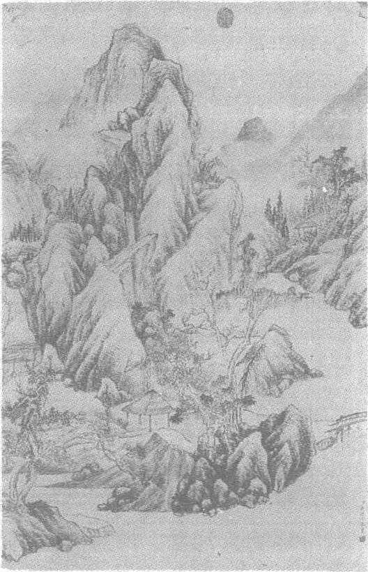 清。钱维城绘。纸本墨笔。纵117厘米,横76.5厘米。北京故宫博物院藏。钱维城(1720—1772年),字宗磬,号幼庵、茶山,又号稼轩,江苏武进人。乾隆十年(1745年)状元,官至刑部侍郎,供奉内廷,为画苑领袖。自幼喜画,曾得董邦达指授。善画山水、花卉,曾从陈书学画花卉写意。山水笔意仿王原祁,丘壑幽深,笔墨沉厚。能界画。有《茶山集》。此幅画山势逶迤,云烟缭绕,山中林木茂密,屋宇隐现。清泉飞泻而下,环绕山脚汇成一片湖水,水光荡漾,木桥横架水上。湖边矶石之上古树盘藤,凉亭掩映,意境清幽闲淡,构图严谨,层次清晰。山石作干笔淡皴,又以浓墨横点,增加了山石厚重的质感,一派晓霜初降的深秋景致。款署〈臣钱维城敬画〉。有〈乾隆御览之宝〉朱文椭圆印一方。