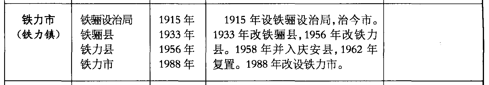 铁力市(铁力镇)铁骊设治局铁骊县铁力县铁力市1915年1933年1956年1988年1915年设铁骊设治局,治今市。1933年改铁骊县,1956年改铁力县。1958年并入庆安县,1962年复置。1988年改设铁力市。