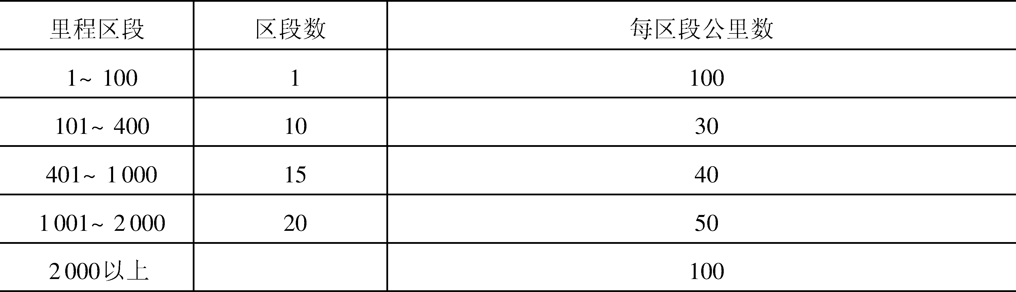 | 释义 | 铁路区段运价率 铁路区段运价率railway divisional freight rate按里程区段别采用的运价率。在货物运价率表上运输里程不是按每公里列载的,而是划分若干区段,每个里程区段采用一个相同运价率。铁路现行运价里程区段划分,如下表所示。参见“铁路货物运价率”。
