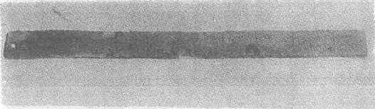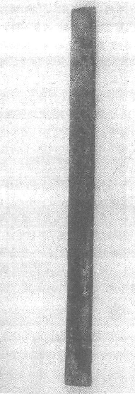 ☚ “新兴辟雍”规矩纹铜镜 四神铜镜 ☛ 铜尺 铜尺西汉。残长4.7厘米,宽2.4厘米,厚1.5厘米。1970年山东省曲阜九龙山西汉鲁孝王刘庆忌墓出土。山东省博物馆藏。此尺用铜制成,残存二寸,通体有剥蚀。正面第一寸阴刻十分,第二寸未刻分。一侧面阴刻一人执剑挥舞纹饰,另一侧是一人手扬长带跳舞的怪人纹饰,背面无刻纹。以残长二寸为4.7厘米推算,则一尺长应为23.5厘米。