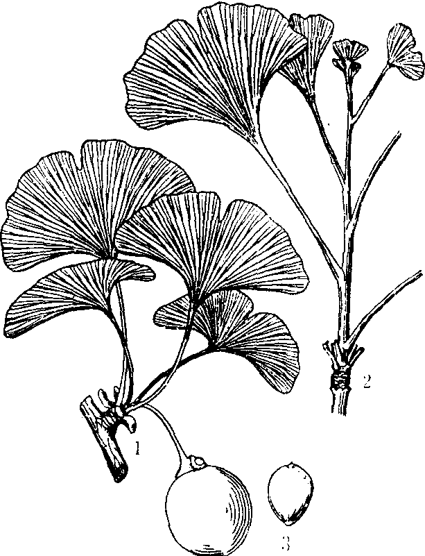 银 杏 1. 果枝; 2. 雌花; 3. 种子 幼树皮淡灰褐色, 浅纵裂; 老树皮灰褐色, 深纵裂。叶扇形, 上缘有浅或深的波状裂刻, 中部裂刻较深; 叶淡绿色, 落叶前变黄色, 具多数平行脉; 有长叶柄; 短枝上叶簇生, 长枝上叶螺旋形排列。雄花为葇荑花序, 4~6个生于短枝上。顶端数芽抽生长枝,其下每节都可能抽生短枝,枝条基部抽生的短枝很短,仅生数片小叶, 结果少, 如无光照条件和营养条件, 不久即枯死。在老树的骨干枝基部或短枝上, 常抽生旺盛枝条, 是一种老树更新现象, 可以培养利用。银杏为裸子植物雌花有两胚珠着生在长柄上, 一般只结一果; 一个短枝可抽生几个雌花, 结3~6果。种子为核果状(非真正果实); 外种皮肉质、黄色;内种皮骨质、白色,长约2.5厘米; 种仁淡绿色, 是供食用部分。银杏属阳性树种,适于背风向阳和光照充足地方栽植。根深, 耐旱, 对大气污染有一定抗性。对土壤条件要求不严, 最好是排水良好、土层深厚、疏松肥沃的沙质壤土,酸性土pH值为4.5或石灰性土壤pH值为8时都能适应。在气候温和、年平均10~18℃、最低温-20℃以上、年降水量600~1 500毫米地区生长良好。低洼水涝、盐碱度高的地方和干燥瘠薄的砾石山地, 生长不良。 品种类型 银杏只有一种,其变种有以下几个:垂枝银杏(G. biloba var. pendula Carr.), 小枝下垂;裂叶银杏(G. biloba var. lacinia Carr.)又称大叶银杏, 叶大裂刻深; 黄叶银杏 (G. biloba var. aureaBeiss.), 叶鲜黄色; 斑叶(花叶)银杏(G. biloba var.uarie carr.),叶有黄斑;近来山东沂源县大贤山织女洞庙发现一株叶籽银杏 (G. biloba var. epiphyllaMak.), 可结圆形、长椭圆形和带叶球果。 银杏栽培品种主要可归为3个类型: ❶梅核银杏类。果圆形或心形,顶部微凹陷; 核卵形或广椭圆形,略扁, 两面显著不同, 两侧棱线呈翼状。如浙江诸暨的大梅核; 广西兴安的桐子果、棉花果、算盘果等。种仁有苦味, 抗旱耐涝。 ❷佛手银杏类。果椭圆形或倒卵形,顶点平或凹陷; 核狭长而尖, 具棱线而翼不显,核饱满,味甘美, 商品价值高。如江苏泰兴的家佛手,吴县的洞庭王; 广西兴安的橄榄佛手、枣子佛手; 浙江诸暨的卵果佛手、长柄佛手、全果佛手、圆底佛手。 ❸马铃银杏。近于上述两个类型的中间类型。果中大,果顶突起明显, 有尖; 核两侧有棱, 翼不明显。果似梅核类, 核似佛手类, 核长大于宽。如浙江诸暨的中马铃、大马铃; 广西兴安的青皮果、黄皮果等。 栽培技术要点 只有中国把银杏作为果树栽培,其他国家主要作为行道树或观赏树。繁殖可用实生、分株、嫁接等方法。实生于当年秋季播种, 如用春播需要层积, 新鲜种子发芽率高, 出苗后当年秋季即可移栽。银杏根部发生萌蘖很多, 可以分株繁殖, 从幼树中挖取雌株根蘖栽植, 成活可靠, 约10年左右开始结果。嫁接用实生苗或分株苗为砧木, 选生长势强、丰产、果大的盛果期雌株,以3年生枝条(具3~4个以上的短枝),在春季用皮下接、劈接和舌接方法均可, 成活率高, 接后3~4年结果。栽植时, 要配置少量雄株为授粉树, 经人工采集花粉, 对水500倍, 加0.1%硼酸, 1%的蔗糖, 喷花, 可增产20~50%。幼树行间,可间作豆类、薯类、花生等作物。施肥都于春秋两季,以秋季施肥为普遍。银杏很少修剪, 只在接后4~5年内分枝过多时疏除部分枝条; 在结果多年, 渐趋衰老时, 进行更新修剪; 老树枯梢现象严重时, 于各主枝基部或主干上一次锯平,形成新的树冠,继续结果。秋季果实变为橙黄色时, 即可采收。最好等待其充分成熟, 自然脱落后, 集中收获。于芦席上堆晒, 使种皮腐烂, 种子与种皮脱离,用水淘净,堆晒2~3小时, 直到种壳发亮时为止。充分成熟的果实, 在低温条件下可较长期的贮藏。 银杏病虫很少, 常见的有: ❶茎腐病。一年生苗受害最重, 使皮层与木质部脱离, 叶片下垂枯死。主要是因夏季炎热, 根颈灼伤, 病菌入侵。夏季行间覆草降低地面温度, 可减少发病。 ❷大蓑蛾。为害叶片,卷成很大的袋囊。用人工摘除越冬虫囊, 喷布杀虫药剂。 ❸天牛类。为害枝干、人工捕捉成虫或药液注入虫孔。 ❹金龟子与木蠹蛾类。用黑光灯诱杀或用1605及锌硫磷等进行防治。 ❺白蚁类。白蚁剥食树木根颈和干部皮层, 蛀食木质部。挖除蚁巢, 用喷粉枪喷蚁穴或用烟剂灭蚁。 经济价值 银杏营养丰富,既是高级的滋补品,又是珍贵的药材。可供炒食或煮成甜食。每100克干果含水分9.1克, 蛋白质13.1克, 碳水化合物71.2克, 钙19.6毫克, 磷427毫克, 铁2.9毫克,此外尚有核黄素、尼克酸、硫胺素等。种仁有补肺、止咳、利尿、清热、平喘、活血等功效; 捣烂外敷, 可治皮肤开裂。种仁含氰氢酸, 不宜多食。叶可提制冠心酮, 可治心血管疾病。花是良好蜜源。木材坚实细致, 可供工艺及雕刻之用。外种皮有银杏酸、银杏醇和银杏二酚,有毒,可以杀虫。银杏大树风姿挺拔, 高耸入云, 植于名胜古迹和古老寺庙, 显得庄重肃穆。幼树笔直刚健, 叶形奇特, 稀疏匀称, 配置于长街两侧, 井然有序; 用于制作树桩盆景, 也格外幽雅, 是良好的绿化、美化的树种。 银杏maiden hair tree;ginkgoGinkgo bilo-ba,别名白果树、公孙树、鸭掌树。银杏科银杏属落叶大乔木。本属仅银杏1种,系中国原产的著名孑遗树种之一。染色体数2n=2x=24(雄株为22A+2Z,雌株为22A+2W)。起源古老,系中国特产的第四纪孑遗树种。银杏科植物发生于古生代石炭纪末期。中生代早期的银杏,为现代种的