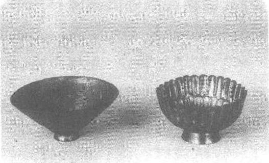| 释义 | 银杯(2件) 银杯(2件)宋。高5厘米,口径9.5厘米,足径3.9厘米。1959年9月四川省德阳县孝泉镇宋窖藏出土。四川省博物馆藏。此杯共两件,其中一件通体光素无纹。杯身直斜下收与外展圈足相接。另一件为侈口、深腹,杯身锤成双层菊瓣形,内底部有突起的珠状花蕊。外底下接外展圈足。此器形制厚重而精致,有高雅之感。