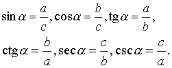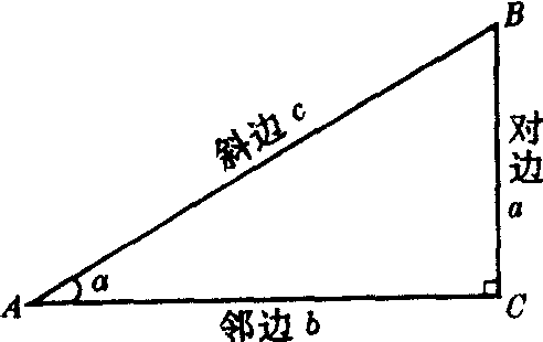 指直角三角形中某一锐角的三角函数.通常用相关的边来表示.如图,在直角三角形ABC中,对于角A(记作a),AC叫a的邻边,用b表示,BC是a的对边,用a表示.AB是三角形的斜边,用c表示,则比值a/c,b/c,a/b,b/a,c/b,c/a分别叫角a的正弦,余弦,正切,余切,正割,余割,这些命名与一般角的三角函数是一致的,因此统称这些比为锐角α的三角函数,并记作
