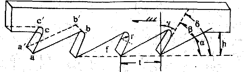 图2 常见齿型 a.三角型; b.直背型; c.折背型; d.凸弧型; e.双刃型; f.M型; g.组合型; h.嵌齿型角α大小与齿背同木材间的摩擦大小成反比关系;齿端角β大小与锯齿强度成正比关系;齿喉角γ大小与切削功率成反比关系。锯齿各角度的关系是α+β+γ=90°。带锯常见角度参数是: 冬季或割硬材时α角为25°~40°,β角为30°~40°,γ角为20°~25°,锯割混合材时α角为20°~22°,β角为40°~41°, 圆锯齿各角度参数表