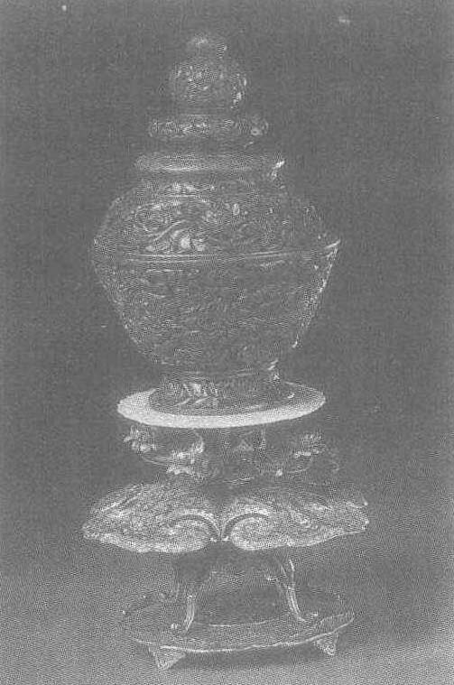 | 释义 | 镂空玉花薰 镂空玉花薰清乾隆。口径14厘米。北京故宫博物院藏。花薰是一种薰香用具,清代流行以玉制花薰,北京故宫博物院与台北故宫博物院现存不少宫廷所藏玉花薰。此花薰盖、器均用碧绿色玉制作。盖呈多级宝塔状,其上雕有莲花、莲瓣及缠枝牡丹。器本身通雕缠枝莲花,其间饰有八宝纹。器内放一鎏金铜碗,缕缕香烟可从透雕的空隙中缓缓散出。香薰下有一青玉琢制的托盘,雕有如意形云头纹。托盘之下为铜胎掐丝珐瑯器座。器座造型复杂,由折枝莲花,如意云形盘,花叶形支架和一圆盘组成。花薰高贵典雅,托盘淡雅怡人,器座富丽堂皇,给人以多层次美的享受,是乾隆时期典型的难度高、工艺精湛的玉制代表作。