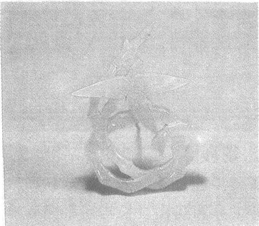 北宋。长6厘米,宽5厘米。1974年北京市房山县长沟峪石椁墓出土。北京首都博物馆藏。玉料青色。玉工从所见的残竹得到启发,独出心裁地将玉饰设计成一段残竹的盘曲状。尽管玉料质地坚硬,却真实地表现出了这种植物的柔韧性,与真正的竹子极为相似。一节间还琢饰出三片竹叶。竹子深受人们喜爱,用艺术形式大量表现这一题材出现于北宋。这件玉竹是迄今所发现最早的一件。