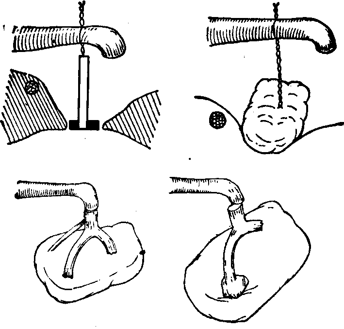 镫骨撼动术 对严重固定的镫骨行撼动术,非但操作不易,而且常可造成镫脚骨折。即使撼动成功,也容易发生再固定。因此,近年来这一手术已较少用。但对固定较轻,易于撼动者,仍不失为可取的手术。其法为用针形、钩形或叉形撼动器在砧骨豆状突、镫骨头或颈部反复加压拨动,有时也可在底板前部加压。如撼动成功,患者即感听力突然提高;有时虽看到镫脚已活动,而听力无明显提高,常是镫脚骨折。区别之法为用细针触压底板,观察镫骨头是否摆动即可明确。 镫骨切除术 本术术式繁多,主要有以下三方面: 底板处理方式: ❶底板碎裂式。 ❷底板全切除式。 ❸底板部分切除式。 ❹底板钻孔式。 采用镫骨型式: ❶聚乙烯小柱。 ❷不锈钢丝系脂肪(或静脉段、明胶海绵等)。 ❸软骨小柱。 ❹聚四氟乙烯(或惰性金属)活塞。 ❺镫脚移位。 ❻保留镫脚。 前庭窗覆盖物: ❶静脉片。 ❷脂肪。 ❸骨膜、软骨膜或结缔组织。 ❹明胶海绵。 上述各种底板处理法、镫骨型式及覆盖物多可错综配合成多种完整的手术方式(图2),它们各有优缺点。现仅简介常用的不锈钢丝系脂肪及聚四氟乙烯活塞两种方法的手术步骤: ❶用镰状刀或微型剪切断镫骨肌。 ❷用小钩针压镫骨颈部以折断镫骨脚并取除之。 ❸用测量针测出砧骨长突下面至镫骨底板间的距离。 ❹切除镫骨底板,对薄底板可先钻一小孔后,以底板钩伸入孔中分片钩除,厚底板则先用刮刀刮薄再如上法钩除。如底板落入前庭,应任其留置,切忌强行钩掏。如作活塞型手术则无需切除底板,只要在底板中部用手捻钻,钻一可容活塞插入的小孔。 ❺按测得的砧镫间距预备好钢丝脂肪型人工镫骨或聚四氟乙烯活塞并装于特制的人工镫骨安装器上。 ❻将人工镫骨装到砧骨长突上。 ❼检查人工镫骨活动度后,手术即告完成。