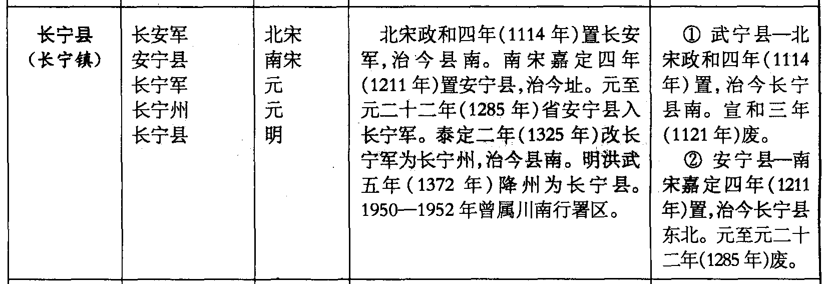 长宁县(长宁镇)长安军安宁县长宁军长宁州长宁县北宋南宋元元明北宋政和四年(1114年)置长安军,治今县南。南宋嘉定四年(1211年)置安宁县,治今址。元至元二十二年(1285年)省安宁县入长宁军。泰定二年(1325年)改长宁军为长宁州,治今县南。明洪武五年(1372年)降州为长宁县。1950—1952年曾属川南行署区。❶ 武宁县—北宋政和四年(1114年)置,治今长宁县南。宣和三年(1121年)废。❷ 安宁县—南宋嘉定四年(1211年)置,治今长宁县东北。元至元二十二年(1285年)废。