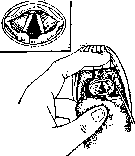间接喉镜检查。左上为间接喉镜检查所见喉象 检查喉腔前部,可将镜柄上抬,使镜面稍转向垂直,即可见到舌根部及其轮状乳头、舌盲孔、舌扁桃体:舌根部静脉、会厌软骨上部、会厌软骨舌面及左右会厌谷。转动镜面可见到会厌喉面及声门前连合,如不能见到时,可使受检者头稍后仰,并发“依”声,或使受检者坐位,检查者取立位检查。如会厌下压,或内卷如Ω状,遮盖喉入口时,则须于局麻下以会厌牵引器牵拉会厌,使之竖起再察看;检查喉腔后部,须将镜柄斜下,使镜面稍呈水平位,可见杓会厌皱襞、杓间区、梨状窝。必要时可使受检者立位,检查者坐位检查之。喉腔上有喉室带显象于声带之上,呈淡红色。喉室带与声带之间为喉室。声带于镜像中呈白色,表面光滑,边缘整齐,发“依-依”声时,声带内收靠拢,呼吸时声带外展分开。声门呈等腰三角形,如是即可观察声带的运动,通过声门区,有时可见上端气管的前壁。 注意事项: ❶喉部各处,后、前、左、右、上、下应依次检查,应列为常规,方不致有遗漏。注意有无充血、肿胀、增生、溃疡; 如有声带运动障碍,应注意喉室或声门下区有无肿瘤、环杓关节疾病或声带瘫痪。梨状窝有唾液潴留可能为环后肿瘤,食管上段肿瘤、异物或咽肌瘫痪所引起。杓间处浅表溃疡或肉芽多见于喉结核患者。 ❷对舌体厚短,舌系带过短,会厌过长或呈婴儿型患者,常使检查困难; 幼儿检查亦多不易成功; 喉前连合处的病变尤易被忽视,凡间接喉镜下不能查清的患者均应作直接喉镜检查。 ❸间接喉镜中所见的影像为喉部的倒像,即喉镜中所示的前部实为喉的后部,但左右并不颠倒。 ❹喉镜中影像呈椭圆形,所示声带、声门及其他组织均为实际长度的2/3; 喉部粘膜颜色与射入光线的强弱有关,强光常使充血的粘膜颜色如正常或更浅,故间接喉镜检查时应注意。 ☚ 喉外部检查 直接喉镜检查 ☛ |