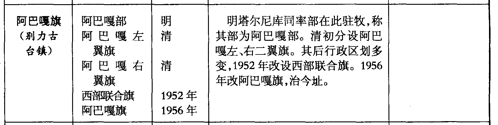 阿巴嘎旗(别力古台镇)阿巴嘎部阿巴嘎左翼旗阿巴嘎右翼旗西部联合旗阿巴嘎旗明清清1952年1956年明塔尔尼库同率部在此驻牧,称其部为阿巴嘎部。清初分设阿巴嘎左、右二翼旗。其后行政区划多变,1952年改设西部联合旗。1956年改阿巴嘎旗,治今址。