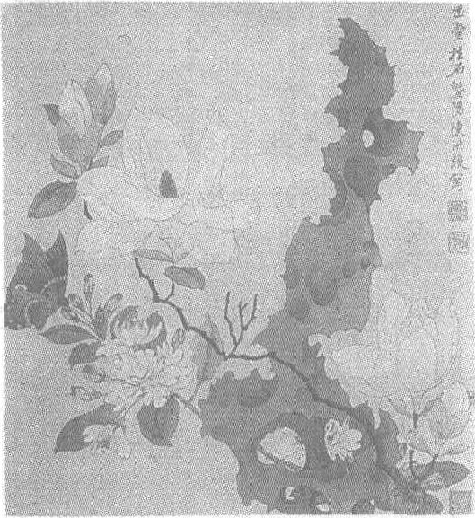 | 释义 | 陈洪绶杂画册 陈洪绶杂画册明。陈洪绶(见《陈洪绶女仙图轴》条目)绘。绢本设色。纵30.2厘米,横25.1厘米。北京故宫博物院藏。此册作山水、人物、花卉等计八开。其一为设色花石:秀逸的湖石前后分傍一枝玉兰和一枝海棠。洁白的玉兰、粉红的海棠交相辉映,别具雅韵,仿佛散发着淡淡的清香。一只美丽的蝴蝶,扑闪着五彩斑斓的翅膀,轻盈地落在海棠绿叶上。图的右上角有题识“玉堂柱石,暨阳陈洪绶写。”下钤白文〈陈洪绶印〉、朱文〈章侯〉二方印。此外图上还有〈芝农秘玩〉等鉴藏印18方。其二为设色罗汉:坡石上,坐着一位额头高凸、络腮胡须满脸的罗汉,他怀抱手杖,正瞪大眼望着双手合十跪于其前、满头金色卷发的人。图的左上边有自题“无法可说,洪绶法名僧悔。”其旁有〈洪绶〉珠文联珠印。其三为设色石泉云树:矶石垒垒,芳草萋萋,流水跌荡,古树苍郁,洁白的浮云宛如玉带般横挂在远岫山腰、林木梢际。图的左下角有自题“老迟洪绶仿赵千里笔法”,下钤〈陈洪绶印〉。其四为设色黄河浪涛:一泻而下的黄河,汹涌澎湃,浊浪滚滚,咆哮着奔向远方。几叶扁舟随波逐流,漂荡在黄涛之间。河的两岸天低云黯,草木瑟瑟。图的右下角有自题:“黄河巨津,老迟洪绶。”下钤〈陈洪绶印〉。其五为设色仕女:一位手持纨扇的仕女,若有所思地走在前面,另有两位侍女手捧针线托盘和丝绣衣袍紧随其后,边走边轻声交谈。图的右上角有题识:“夔龙补衮图,陈洪绶书于静香居。”钤〈陈洪绶印〉、〈章侯〉二方印。其六为设色溪涧石桥:重峦叠嶂,气势雄浑的远山间,如流的瀑布蜿蜒地沿着山势倾下,汇入布满矶石的溪间,石桥上面相对坐着二人。图的右上角题:“溪石图,洪绶。”下钤〈陈洪绶〉、〈章侯〉二方印。其七为设色江渚归帆:暮色苍茫,晚风初起,在水上忙碌了一天的人们,在浅吟低唱的芦荻相伴下,落帆收缆,正慢慢地向港湾靠拢。掩映在茂密的树丛中的村落及远山披上了一层淡淡的轻雾。图的右上角有自题:“远浦归帆,仿赵大年笔意,老莲洪绶”,下钤“章侯”印。其八为设色湖山:近处江水浩渺,碧波荡漾。远处山岭逶迤,连绵起伏,洁白的小花,星星点点开满山崖。青山绿水间洋溢着浓浓的生机。图的左上角有题款“仿李唐笔意,洪绶。”下钤〈章侯〉印。此册画法工整,趣味古拙,设色浓淡相宜。山水、人物、花卉各具特色,无不精妙,堪称陈氏的佳作。