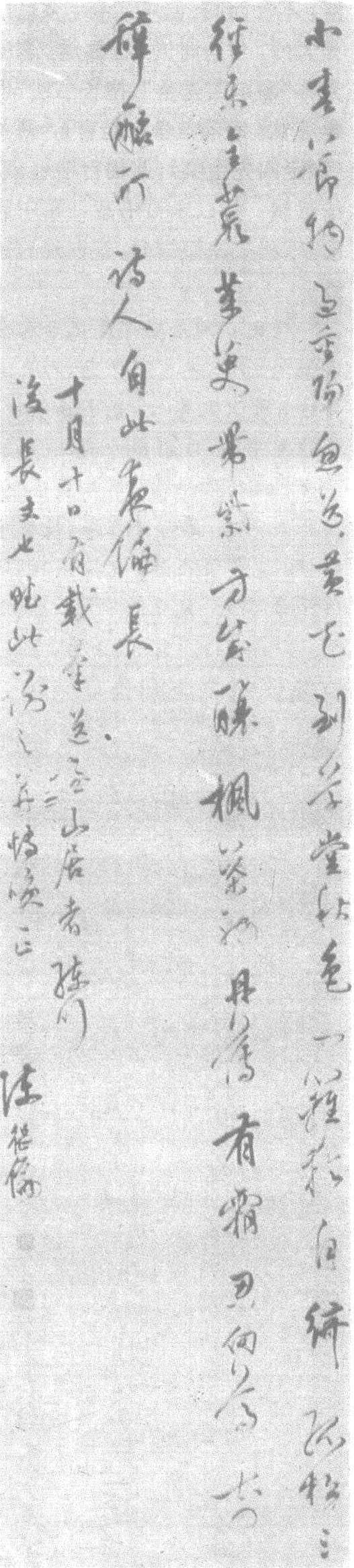 明。纸本。纵237.8厘米,横54厘米。北京故宫博物院藏。陈继儒(明嘉靖三十七年—明崇祯十二年,即公元1558—1639年),字仲醇,号眉公,又号糜公,华亭(今上海市松江)人。诸生。隐居昆山之阳,后筑室东佘山,杜门著述。颖悟博学,工诗文,短翰小词极有风致。擅画水墨梅花、水仙、奇石等。书师苏、米。著有《眉公秘笈》、《妮古录》、《皇明书画史》等。此幅作品,行书七律一首,书法出入苏轼、米芾之间,自然流畅,秀雅疏朗,富有韵致,体现了文人书法的艺术特点。