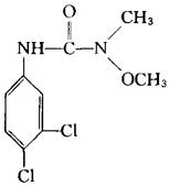 取代脲类选择性除草剂。 化学名称为3-(3,4-二氯苯基)-1-甲氧基-1-甲基脲。化学结构式如下。纯品为白色结晶固体,熔点93~94℃,24℃时蒸气压为2×10-3Pa,微溶于水及脂肪烃,易溶于丙酮、乙醇、苯、甲苯、二甲苯等有机溶剂。在溶点下和溶液中稳定,在酸、碱及潮湿土壤中缓慢分解。芽前或芽后除草剂,具有内吸和触杀作用,主要通过杂草根部吸收,叶、茎吸收较少。在含叶绿素部分,抑制杂草的光合作用,阻碍希尔反应,破坏碳水化合物的形成,使植物饥饿致死。 主要用于玉米、棉花、大豆、冬麦、高粱、花生、马铃薯、甘蔗、菜豆、豌豆等以及果园防除稗草、马唐、狗尾草、看麦娘、野燕麦、鸭跖草、铁苋菜、马齿苋及藜等一年生单子叶和阔叶杂草。对人、畜低毒,大鼠急性口服LD50为4000mg/kg,对鱼类低毒。