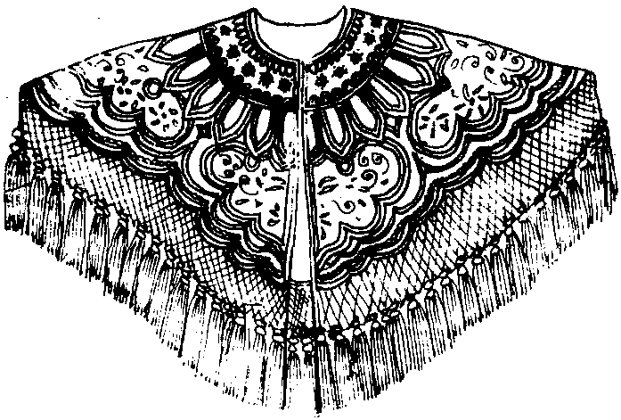 | 释义 | 古代名物 > 冠服類 > 身服部 > 襟袖帶佩 > 雲肩 雲肩 yúnjiān 亦稱“披肩”。古時源自北方少數民族的一種肩飾。隋唐時在上層社会較爲流行,敦煌壁畫可見形象資料。元代成爲官服定式,貴族男女均可服,爲質孫服的組成部分。作爲婦女服飾,明清時曾一度流行柳葉式小雲肩,清代後期則流行飾以排鬚的樣式。其花樣繁多,大小不一,質地也因時地而異。或爲民間禮服之飾,如女子結婚時往往服用。或日常服之,如光緒末年,江南婦女由于低髻垂肩,則用之以防髮髻油膩沾污衣領。但作爲朝服則有定制。《元史·輿服志一》:“雲肩,制如四垂雲,青緣,黄羅五色,嵌金爲之。”《清稗類鈔·服飾》:“披肩爲文武大小品官衣大禮服時所用,加於項,覆於肩,形如菱,上繡蟒,八旗命婦亦有之。”