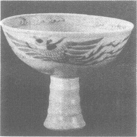 | 释义 | 青花寿字凤纹高足瓷碗 青花寿字凤纹高足瓷碗元。高9.8厘米,口径12.2厘米。1972年河北省定兴县元代窖藏出土。碗口微撇,深腹,碗壁弧度舒缓。器壁上部较薄,迎光可见另一面纹饰。竹节状高足。釉为淡青色。碗内口沿边绘一周缠枝纹。碗心有一青料书写的“寿”字。碗外壁以青料绘两只飞凤,凤头似鸡头,双翅平展,3条尾羽,形象非常美丽。两只飞凤间绘如意云头。此高足碗造型优美,纹饰自然飘洒,是元代青花瓷器中的精品。
