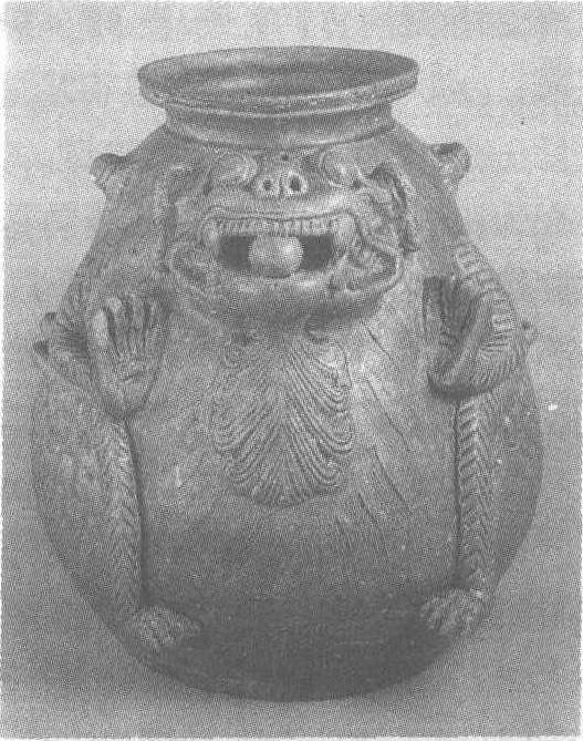 西晋永宁二年(公元302年)。高27.9厘米,口径13.3厘米。1976年江苏省宜兴县周墓墩出土。江苏省南京博物院藏。此盘口尊的基本造型为鱼篓状。工匠在“鱼篓”上精心制作贴塑一只神兽作为装饰,故称兽形尊。神兽双目凸出,耸鼻,翘胡,獠牙外露,舌吐出,口含一珠;器腹即兽腹上刻梳纹表示兽毛,贴塑的长须垂胸;四肢亦为捏塑成形后安于器上,后爪似撑扶全身重量,前爪掌心朝外,似将要有所动作;器腹上还贴出兽翼、兽尾。神兽愤怒至极,待腾跃攫抓一瞬间的形象被塑造得惟妙惟肖。全器施青灰釉,釉色光洁细腻。