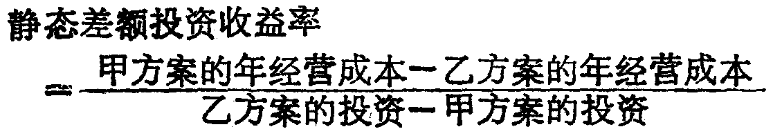 | 释义 | 静态差额投资收益率亦称“追加投资效果系数”。是比较和选择建设方案时所采用的表示相对经济效果的简便的静态指标之一。它表示一个方案比另一个方案可追加的(多化的)每单位投资所能获得的年经营成本的降低额。假设甲方案的年经营成本大于乙方案,而乙方案的投资额大于甲方案,则计算公式为: