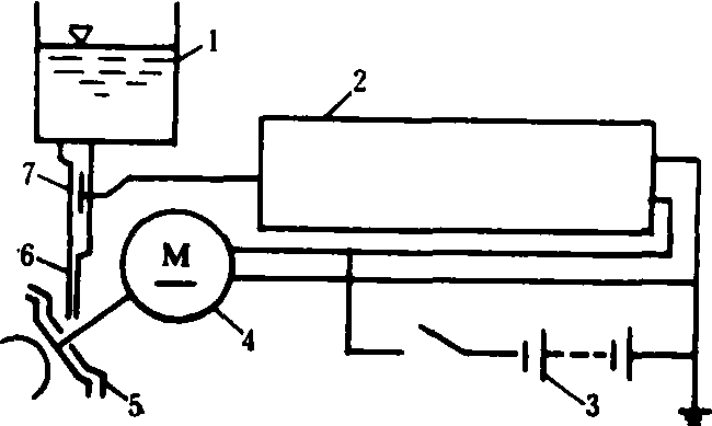 图2 手持式静电喷雾器示意图 1.药液瓶; 2.静电高压发生器; 3.电源; 4.微电机; 5.转盘; 6.药液导管; 7.高压电极 背负式机动静电喷雾机 结构如图3。通常是在