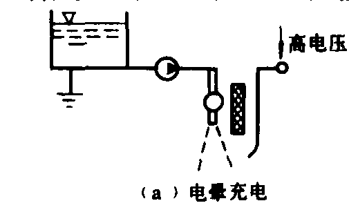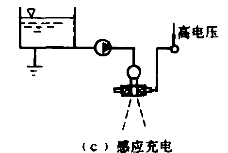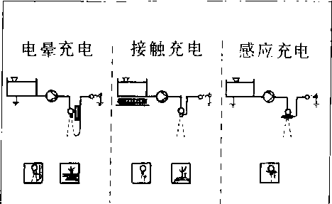 图1 三种充电方法示意图 雾滴充电方法 有电晕充电、接触充电和感应充电等三种(图1)。 电晕充电是在喷头出口雾化区设置一个或多个尖端电极,在通常气压及小输出功率的条件下利用高压电(至少达到空气的绝缘击穿电压,即电场强度为3500伏/毫米以上)及电极尖端的非自持性气体放电,使尖端电极附近形成单极分子电离区,雾滴经过这个电离区时形成带电雾滴。接触充电是高压电(1万伏以上)和即将雾化的药液直接接触,使喷嘴及药液上产生电荷堆积,通过电传导把电荷转移到药液雾流中,使雾滴带电。感应充电是在喷头出口处配置一个感应环,利用静电感应原理,使药滴在经过静电场时,产生感应电荷。要求药液射流末端处在电场强度最大的部位,则静电感应最为显著,药液在雾化过程中受感应而带电。与接触充电相比,在获得同样荷质比的情况下,感应充电所需电压要低得多,大约在3 000伏左右。因此,这种方法有利于保证绝缘。 种类 静电喷雾机有地面喷雾和高空喷雾两种形式。进行地面静电喷雾的主要机具有手持式静电喷雾器、背负式机动静电喷雾机和大型静电喷雾机等,一般均属微量喷雾。高空静电喷雾主要由农用飞机来实现。 手持式静电喷雾器 结构如图2。用干电池或小型蓄电池提供6伏电源,经振荡变压由倍压整流得到1~2万伏的直流高压,用接触充电法使药液在高速转盘雾化过程中形成荷电雾流。