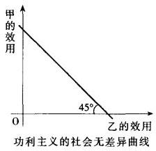 功利主义认为,社会无差异曲线应是斜率为-1的直线(如图所示),社会福利等于社会所有成员的效用之和。 如果用数学方式来表达的话,在一个甲、乙两人构成的社会中,社会福利 W=U甲+U乙 这意味著,在社会看来,不管社会的贫富差距如何,甲、乙两人的每一单位效用是同等重要的。甲减少一单位的效用,乙增加一单位的效用,社会的福利水平不会改变,反过来,如果乙(穷人)减少一个单位的效用,甲(富人)增加一个单位的效用,两人的效用水平差距扩大了,社会仍然认为社会的福利水平保持原状。可见,功利主义的社会福利只取决于各社会成员的效用水平,而与各社会成员之间的相对关系无关。据此得出的补偿原则(compensation principle)认为,如果某种变化使得一些人的境况变好,而一些人的境况变坏,只要境况变好的那些人的得益(增加的效用)大于境况变坏的那些人的损失(减少的效用),那么这种变化就是一种社会福利的改进,从社会来看,变化后的状况优于变化前的状况。