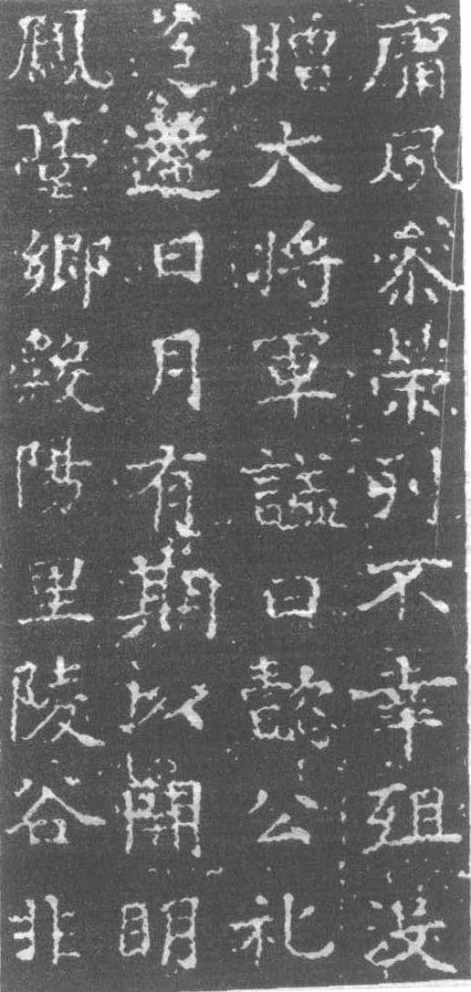 韋匡伯墓志 (局部) 偽鄭(王世充割據)開明 二 年(620)刻。正書二十二行,行二十二字。蓋篆書陽文題“大將軍韋匡伯之墓志”九字。開明二年為唐開國之初,即偽鄭滅亡前年,故視為唐楷。書無潑辣味。清· 光緒中( 1875-1908)于河南洛陽出土,歸長白托活洛。今不詳所在。 |