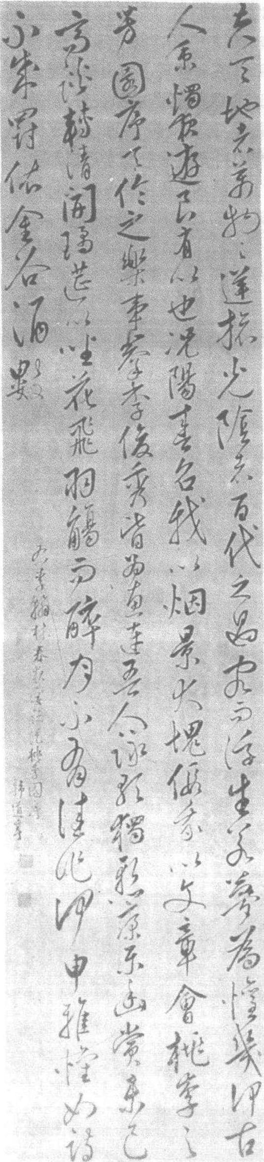 明。纸本。纵145.3厘米,横32.9厘米。江苏省苏州博物馆藏。韩道亨,生卒不详,字颖泉,于草法的研究和教学方面颇有建树,草书宗法二王,法度严谨。万历四十一年,即公元1613年尝书《李白蜀道难卷》、《张君度补图。此幅草书运笔刚劲有力,结体宽闲疏朗,章法井然有序,体现了作者娴熟的书艺。