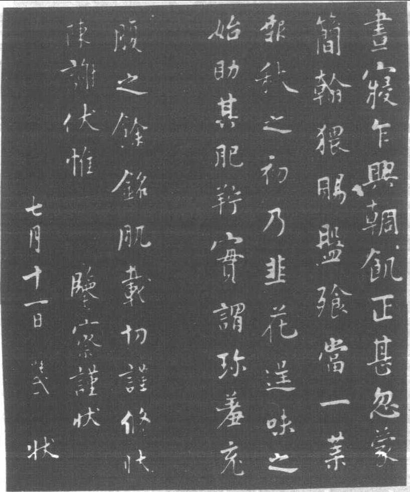 | 释义 | 韭花帖 韭花帖楷书法帖。五代杨凝式所书尺牍。书法出于颜(真卿)而秀于颜,深得“二王”神理,风度凝远,超脱含蓄。清人包世臣评说: “盖少师(杨凝式)结字,善移部位,自‘二王’以至颜、柳之旧势,皆以展蹙变之,故按其点画如真行,而相其气势则狂草”(《艺舟双楫》)。对宋、元的书家有较大影响,历代评价甚高。曾刻入《玉烟堂帖》、《停云馆帖》、《秀餐轩帖》、《三希堂法帖》等汇刻丛帖。 ☚ 张好好诗卷 夏热帖 ☛ 韭花帖 韭花帖五代*杨凝式行书墨迹。共7行。董其昌曰:“少师(凝式)《韭花帖》,略带行体,萧散有致。比少师他书,欹侧取态有殊。然欹侧取姿,故是少师佳处。”字矩、行矩颇大,显得疏朗,但不松散。高雅淳古,简静闲逸。原罗振玉有藏本,后不知去向。刻入《玉烟堂帖》、《停云馆帖》、《三希堂法帖》等。又收入日本《百爵斋历代名人书法》。 ☚ 步虚词 夏热帖 ☛ 韭花帖 韭花帖五代*杨凝式行书墨迹。共7行。董其昌曰:“少师(凝式)《韭花帖》,略带行体,萧散有致。比少师他书,欹侧取态有殊。然欹侧取姿,故是少师佳处。”字矩、行矩颇大,显得疏朗,但不松散。高雅淳古,简静闲逸。原罗振玉有藏本,后不知去向。刻入《玉烟堂帖》、《停云馆帖》、《三希堂法帖》等。又收入日本《百爵斋历代名人书法》。 ☚ 步虚词 夏热帖 ☛ 韭花帖 286 韭花帖行楷法帖。五代杨凝式书。书法雅正,丰神洒脱,字距、行距之大为前所未有。对宋、元书家有重要影响。帖后有元大德八年(1304)张晏题跋,另有明贾希朱、陈继儒等人跋。 ☚ 苦笋帖 寒食诗帖 ☛ 韭花帖五代楊凝式書。麻纸,高八尺。為行書尺牘 “晝夜乍興饑正甚忽蒙簡翰猥”云云七行。 是書多顯楊風子 (凝式)<神仙起居帖>之迹,沈潜味深,淳古雅致。風度凝遠可愛,頗存晉人矩度,尤深得王羲之 <蘭亭序>神理。明董其昌之跋引有宋蘇軾語:“唐末喪亂,人物凋落,文采風流盡掃地。獨楊凝式筆勢雄傑,‘二王’ (羲之、獻之)、顏 (真卿)、柳(公權)之餘,堪稱書之豪傑。”而沈曾植云:“<韭花帖>純然董 (其昌) 法,雖有墨本,不足以研索之據。”真迹初藏宋宣和内府,其後幾經遞傳,清末歸上虞羅氏。清内府所藏為摹本,曾由有正書局等復製。刻有《玉烟堂帖》本、《停雲館帖》本、《三希堂帖》本、《秀餐軒帖》本、《戲鴻堂帖》本 (題作 <晝寢乍興帖>,有董其昌跋)。