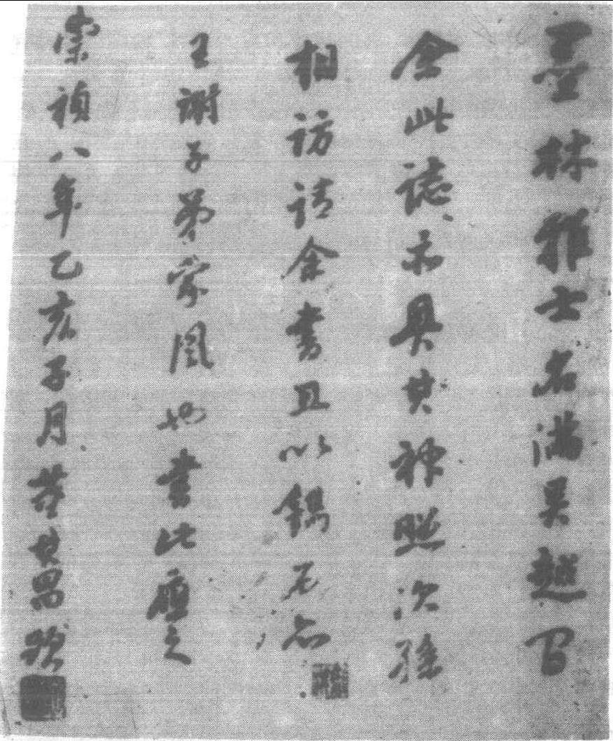 項墨林墓志銘稿 (局部) 明·崇禎八年(1635)刻。董其昌書。紙本墨書。此係明代大鑒藏家項墨林(元汴)之墓志,董氏乃其至交,八十一歲書。書體楷、行相間,沉潜中含遲澀味,足見其昌書法造詣之深湛。已流入日本,屬高𡻅槐安居舊藏,今歸東京博物館。 |