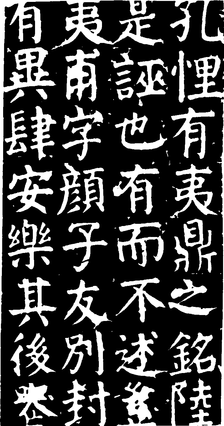 顔氏家廟碑 (局部) 唐·建中 元 年(780)刻。顏真卿撰并書,為其父惟貞所建,因亦名〈顔惟真家廟碑〉。又因四面刻,俗稱〈四面碑〉。前後兩面各二十四行,行四十七字;左右兩側各六行,行五十二字。全為楷書。額篆書題“顏氏家廟之碑”三行六字。碑陰記後,刻有宋太平興國七年 (982) 重立記,示明唐季亂離時,是碑嘗倒僕郊野,後經再建之情况。又碑陰之上鎸刻〈齋堂記〉,亦有小篆額,既具小碑之形,傳為宋釋夢英大師所書。〈家廟碑〉屬顏氏晚年(72歲)之作,筆力雄健,結體莊密,屬真卿書碑中最完好者。又此碑與〈大字麻姑仙壇記〉 為顏真卿後期楷書之杰出作,最足代表顏氏楷書之典型。而且兩碑均能突出 “顏體”之獨到風格,并於書藝上達到高度之成熟與完整。碑存陝西西安碑林。 |