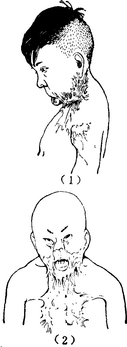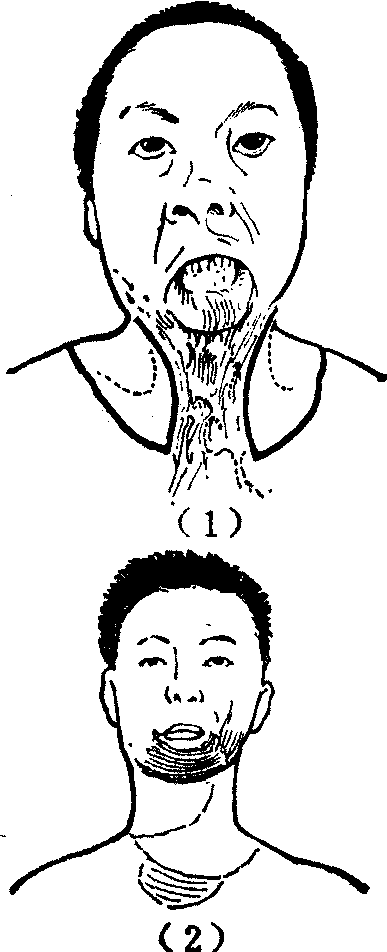 图1 颈部重度瘢痕挛缩所致颏胸粘连 (3)中度: 介于轻度与重度之间的程度不等的挛缩。常由颈部的增生瘢痕所致,瘢痕面积较大,但仍限于颈部。颏部多亦受波及,形成较颏胸粘连为轻的颏颈粘连,致颏颈角消失。仰头时可能出现下唇轻度外翻,和瘢痕对口角、鼻翼、耳垂、下睑等的轻微牵扯,但低头时即均基本恢复常态。头部后仰和转动较受限制。 手术治疗应俟瘢痕稳定已趋软化基底松动后施行。术前准备,应加强口腔卫生保洁,瘢痕表面如有溃疡,也须给予适当处置。 手术要点是: ❶保证手术过程中呼吸道的畅通; ❷彻底松解挛缩; ❸妥善修复创面。 为保证呼吸道畅通无阻,应在经鼻清醒气管内插管麻醉下进行手术。否则,在麻醉诱导过程中,一旦发生喉痉挛或呼吸道梗阻时,因受体位限制,气管切开术或其他紧急抢救措施均难施行。如在术中发生,则临时再行气管内插管,操作不便,且不免招致创口污染。故严重挛缩,虽然头部不能后仰,多只能采用盲插法,难度较大,但亦必须进行。经口插管,在张口状态下不利于挛缩的彻底松解,应经鼻插入。如插管经反复试探确有困难时,可考虑在局部浸润麻醉下,先在颈部挛缩的最紧张部位作一条或几条横向切口,以使头部后仰,降低插管的难度。静脉麻醉法有防止术后呕吐污染创口,以及复苏快等优点,最宜于采用。 为便于彻底松解挛缩,术时应将两肩垫高,以便随挛缩的松解头部有得以充分后仰的余地。挛缩的松解必须彻底,颈阔肌较浅、多亦因烧伤而发生挛缩,也须切除。如为轻、中度挛缩,可将瘢痕完全切除,其与胸腋颌面瘢痕相连的重度挛缩,则切除范围多以能达到充分的松解为限,位在颈侧的创缘应切成锯齿状。术中能否显露出正常深度的颏颈角,可作为检查松解是否彻底的可靠标志。 修复创面应根据创面大小,邻近及周身供皮条件等选择皮片、皮瓣或皮管移植法。 中厚或全厚皮片移植术最常采用,如为包括颌面和胸腋部的重度挛缩,则常是惟一可行的方法。术时应将所植皮片围绕甲状软骨四周行绷线缝合,以保持较好的固定,避免因吞咽活动妨碍该部皮片存活。皮片法的优点是操作简便易行。缺点是因在日常生活和工作中,头部多处于俯首位,因而助长了皮片存活后的皱缩。故术后必须及时采取有力防范措施,以维护稳定的疗效。 皮瓣移植术的皮瓣,多取自颈部及其邻接的前上胸壁。该部皮肤富于弹性,伸展性强,皮下组织较薄,松动,血运好,适于施行局部皮瓣手术。如为轻度的蹼状瘢痕挛缩,宜采用单一或连串Z成形术(图2)。如为轻、中度挛缩,应将颈部残留的正常皮肤,或前上胸壁的皮肤充分加以利用,形成局部皮瓣,旋转推进移转后,用以修复全部创面,或一部分创面,重点是甲状软骨前方部位的创面,其不足部分以皮片移植补充。局部皮瓣的供皮区偶可于行广泛的皮下潜行剥离后缝合,多需移植皮片(图3 )。此法操作虽较单纯皮片移植修复复杂,但术后皮肤色泽好,厚度适宜,外形佳,疗效稳定。此外,还有游离皮瓣法,可以不受局部供皮条件的限制。但应注意选择皮下脂肪层较薄的供皮部位,以免外形臃肿,致使颏颈角不甚显著。