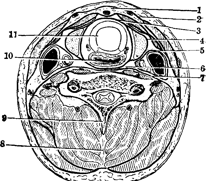 颈筋膜及颈筋膜间隙(通过第6颈椎的断面模式图) 椎前层 椎前层是颈筋膜的深层,沿后正中线有与浅层相同的附着,它覆盖颈后部肌并构成颈后三角的底。此层在颈侧部附着于颈椎横突;覆盖斜角肌,继转向内侧覆被脊柱颈部前面的肌,并与对侧者续连。它向上到达诸肌的起点;向下达斜角肌在肋的止点,并沿脊柱颈部前后诸肌向下延续。从颈部深处出现的神经(如臂丛)、血管(如锁骨下动脉)穿过肌间隙时,常携带椎前层向外凸出构成的筋膜鞘,鞘最终与神经血管的外膜融合。 颈动脉鞘 颈动脉鞘是颈部大血管周围的较致密结缔组织鞘,是颈筋膜的一部分,它与其周围的颈筋膜浅层、气管前层及椎前层互相移行。颈动脉鞘内有颈总动脉及其末支的一段、颈内静脉和迷走神经。动脉在内侧,静脉在外侧,神经在二者的后方。交感干位于鞘与椎前层之间。 颈筋膜间隙 颈筋膜各层之间及其与颈动脉鞘之间都充满疏松结缔组织,容许诸结构之间有一定的活动余地。疏松结缔组织填充之处即颈筋膜间隙。既然筋膜各部是彼此接连的,其间隙亦互相沟通。重要的间隙有: ❶气管前间隙,位于气管与舌骨下肌群之间,它向上止于甲状软骨,向下方通至前纵隔。 ❷食管后间隙,位于食管与椎前筋膜之间,向下沿椎前筋膜直达后纵隔。 ❸咽后间隙向下与食管后间隙相通,向上直达颅底。 ❹咽外侧间隙位于咽的侧方与颈动脉鞘之间; 左右咽外侧间隙借咽后间隙连通,三者合称为咽周间隙。上述四个间隙绕过甲状腺而互相连续。因此,咽附近的感染可沿食管后间隙降入后纵隔,向前蔓延至气管前间隙,并累及前纵隔。 ❺椎前间隙位于椎前层与颈椎骨膜之间,上起自颅底,向下延伸至后纵隔。其中有头长肌和颈长肌以及下降于肌表面的交感神经干。 ☚ 颈肌 胸肌 ☛ |