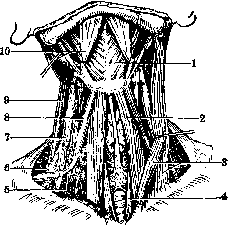 颈 肌 ❸胸骨甲状肌较宽,覆于甲状腺浅面,起自胸骨柄及第一肋软骨后面,肌束行向上外,止于甲状软骨斜线。 ❹甲状舌骨肌是胸骨甲状肌的上延部分,止于舌骨体外侧部及舌骨大角。两侧舌骨下肌群之间有一正中肌间隙,由上往下在中间深处可摸到舌骨体、甲状舌骨膜、喉结、甲状软骨前缘、环甲膜、环状软骨、第一气管软骨环、甲状腺峡及其下方的气管软骨环。此群肌的血液由甲状颈干的甲状腺下动脉分支供给;神经支配来自颈襻 (C1~3),颈襻的上根在甲状软骨平面发支至肩胛舌骨肌上腹、胸骨舌骨肌及甲状舌骨肌,下根(即颈降神经)在下方发支至肩胛舌骨肌下腹、胸骨舌骨肌及胸骨甲状肌。舌骨下肌群的功能:降喉及舌骨;甲状舌骨肌可以提喉。这些运动出现于发低音和吞咽时喉与舌骨已上升以后;它们也和舌骨上肌群共同固定舌骨,为舌的运动提供稳固的基础。 舌骨上肌群 舌骨上肌群包括二腹肌、茎突舌骨肌、下颌舌骨肌及颏舌骨肌。下颌舌骨肌是构成口底的肌,二腹肌及茎突舌骨肌位于其下方,颏舌骨肌位于其上方,它们发生于腹直肌原肌块的上延部分。 ❶下颌舌骨肌起自下颌体的下颌舌骨肌线,前分肌束的短腱止端和对侧肌交织构成正中缝。其后分纤维止于舌骨。两侧下颌舌骨肌形成活动的口底,覆以筋膜与粘膜,支持舌。此肌受下颌神经的下颌舌骨肌支支配。功能: 收缩时使口底和舌上升,如牙在此时咬合,则使舌压向后方,协助吞咽;此肌亦有降下颌作用。 ❷二腹肌有前、后二腹:后腹起自乳突切迹,行向前下;前腹起自下颌骨二腹肌窝,行向后下。二腹连以中间腱,借二腹肌滑车缚于舌骨大角和舌骨体。前后腹来源不同,故神经支配亦异:前腹由下颌神经的下颌舌骨肌支发支支配;后腹由面神经的分支支配。功能:降下颌、提舌骨、可拉颏部向后下,协助翼外肌将下颌骨旋转至张口位置 (此时舌骨下肌群抵消其上提舌骨的力)。肌电图可见二腹肌的开口作用继发于翼外肌之后,特别在大张口时。此外,下颌骨处于休息位置时前腹也有电位活动,可能是支持舌骨。 ❸茎突舌骨肌位于二腹肌前方并与之平行起自茎突,止于舌骨体与大角交界处。肌受面神经的茎突舌骨肌支支配。功能:拉舌骨向上后,但向上的作用被舌骨下肌群的收缩所抵消。 ❹颏舌骨肌起自颏棘,止于舌骨体,两侧者在正中线相邻。此肌由第1~2颈神经前支的分支支配。功能: 拉舌骨向前,缩短口底。 椎前肌群、斜角肌群与枕下肌群 ❶椎前肌群包括颈长肌和头长肌、头前直肌和头侧直肌;前二肌沿颈椎及上位三个胸椎的前面排列; 后二肌居头最长肌上分的深面偏外侧。 ❷斜角肌群: 包括前斜角肌、中斜角肌和后斜角肌,张于第1~2肋骨与颈椎横突之间。 ❸枕下肌群亦称项肌,包括头后大直肌、头后小直肌、头上斜肌和头下斜肌。各肌的起、止,神经分布与功能,见附表。 颈肌 的 肌群