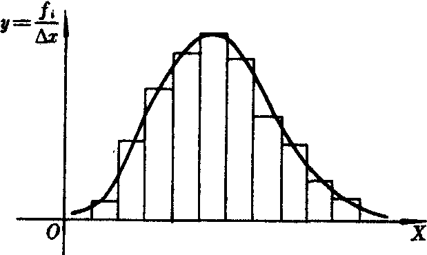 ❹作频率直方图 在X-O-Y直角坐标系中,以X轴上各区间Δx′i= (x′i,x′i+1) (i=1,2,…,l-1)为底,以频率与组距之比yi=fi/(x′i+1-x′i)为第i个长方形的高 (即纵坐标)画一排竖直的长方形,即所谓频率分布直方图,因为每个竖直的长方形面积恰好近似地代表了X取值落入“底边”的概率,所以该图大致地描述了X的概率分布状况。