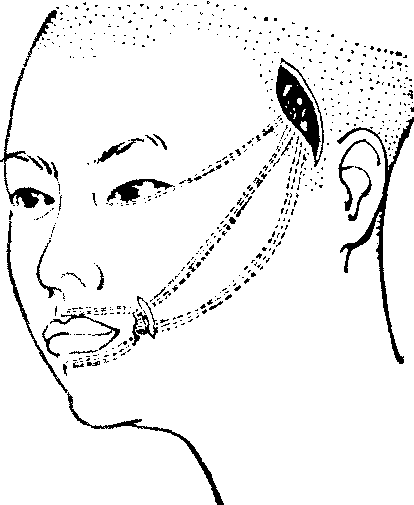 图1 颜面神经麻痹(左侧) 治疗,中枢性麻痹应针对病因,周围性麻痹应根据病程的早晚采取相应的措施。 周围性麻痹的早期治疗,目的在于设法恢复神经功能,方法包括针灸、减压术、神经吻合术、神经移植或神经交叉吻合术和神经搭桥术等。针灸疗法可用于能排除中枢性病因确诊为Bell面瘫的病例,并配合应用扩张血管、消肿和营养神经的药物,以及物理治疗等措施。减压术——面神经管下段减压术,可考虑用于Bell面瘫发病在两个月以内,急性期已过仍未见明显好转病例。神经吻合术,当面神经因外伤或手术误伤切断时施行。如有神经缺损,在条件适宜的情况下,可行神经移植连接。如条件不足,可牵引神经断端暂与邻近组织缝合固定,以防回缩。并作好明显标志,积极创造条件,争取及早行神经移植修复术。神经交叉吻合术,当面神经近侧端,因创伤、感染或瘢痕等原因已无法寻觅,而表情肌尚未显著萎缩时,可以考虑采用。即将舌下神经、舌咽神经、副神经或膈神经切断,以其近侧断端与面神经的远侧端相吻合,代替面神经中枢的功能。惟此种手术系转借其他中枢神经的冲动以引起面部表情肌的收缩,故甚难期望能产生对称协调而自然的表情活动。面神经搭桥术,为取1~2股腓肠神经,横跨过上唇皮下组织吻合于健侧的颊支和患侧的面神经末梢支之间的手术方法(图2)。