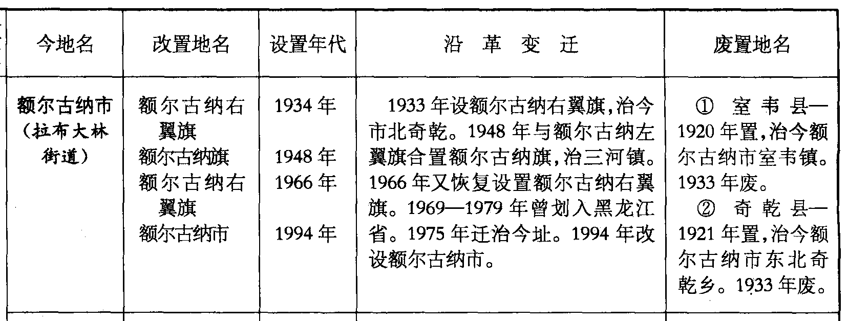 额尔古纳市(拉布大林街道)额尔古纳右翼旗额尔古纳旗额尔古纳右翼旗额尔古纳市1934年1948年1966年1994年1933年设额尔古纳右翼旗,治今市北奇乾。1948年与额尔古纳左翼旗合置额尔古纳旗,治三河镇。1966年又恢复设置额尔古纳右翼旗。1969—1979年曾划入黑龙江省。1975年迁治今址。1994年改设额尔古纳市。❶ 室韦县—1920年置,治今额尔古纳市室韦镇。1933年废。❷ 奇乾县—1921年置,治今额尔古纳市东北奇乾乡。1933年废。