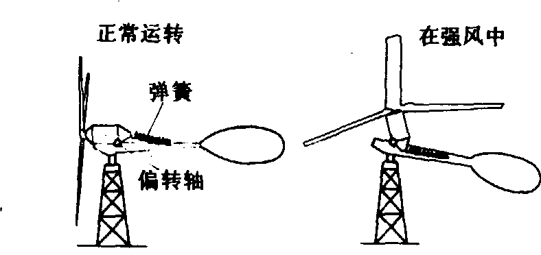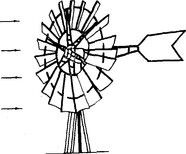 图6 CP-λ与CQ-λ曲线 高速风力机仅有2~4个风翼,在同样直径和风速下比低速风力机的转速高得多, 因此在输出相同功率时, 风轮要轻得多; 它能承受较大离心力; 在风轮静止时所受轴向推力小; 其成本和重量均比低速风力机小。但起动力矩小, 无特殊装置时, 至少要有5米/秒的风速才能转动。多适用于发电机, 离心水泵等机具。 风力机的一般结构 一台水平轴型风力机由风翼、调向装置、调速装置、变速器和固定机架组成,垂直型风力机可简化或不用调向装置。 风翼是受力运动的部件,低速风力机大都采用薄金属片制成略凹的翼型,这些翼片固定在环形支架上构成一个动轮;高速风力机则都采用流线型翼片,用铝合金、玻璃纤维和不锈钢等材料制成。它们可直接固定在机轴的轮圈上。 调向装置是当风向改变时,能自动调节风轮方向的装置。这类装置有尾舵、侧风轮、伺服电机系统等。尾舵主要用于风轮直径不超过6米的低速风力机。侧风轮则是将一个小风轮安装在机舱的侧面,其转轴与风轮主轴垂直,通过蜗轮蜗杆机构使机舱因风向改变而旋转。与尾舵相比,其优点是转动平稳柔和。伺服电机系统是调向伺服电机由风向标和风轮驱动的测速电机控制,可在风轮转速改变时,测速电机的电压也随之改变,然后驱动伺服电机旋转使风轮恢复到迎风方向。 调速装置是为保持风轮转速恒定的装置。这类装置的结构有多种多样。一类是固定叶片的调速器,如采用绞接尾舵和空气制动器等。另一类为可变桨距调速器,如利用飞球等配重和弹簧改变翼片的桨距调整风轮转速。 变速器是改变风轮轴转速的装置。一般都采用速比不等的齿轮组完成。 机架是支持风轮和其他装置的部件。较大型的风力机,其机架下大上小,称为塔架。由于机架还承受风轮旋转时产生的不同频率的振动,因此对机架要求具有较高的刚性,以免发生共振。小型风力机的机架较为简单,常以钢管和钢索稳固在地基上。 风力机windmill将风能转变为机械能的动力机。风能是一种无污染可再生的能源,当风通过风力机的风轮时,风的动能就转变为风轮旋转的机械能。可用于驱动提水机、发电机和一些固定作业机械如农产品加工机械等。中国东南沿海及内蒙古、甘肃、新疆等边远地区,风力资源比较丰富,适宜发展0.1~3千瓦级的风力发电机、风轮直径5~8米的风力提水机等。国际上80年代致力于发展50~100千瓦级的风力发电机,并且采用群体式的“风力田”形式,把几十以至几百台风力机集中安装在一个地区。