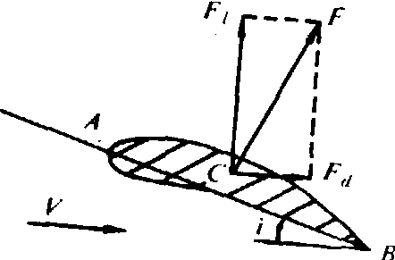 风轮是吸收风能后旋转产生功的部件。它是由一定数量和一定长度的风翼组成的。风轮旋转是由于气流通过翼面时,翼上部的风速比下部快,因而上部压力低于下部压力,产生了力F(图3)。F可分解为垂直于气流的分力Fe和平行于气流的分力Fdo Fe为升力,使风翼旋转运动。Fd为阻力。因此,风翼的断面形状和迎角i(翼弦与风向的夹角)对风轮的运动有很大影响。