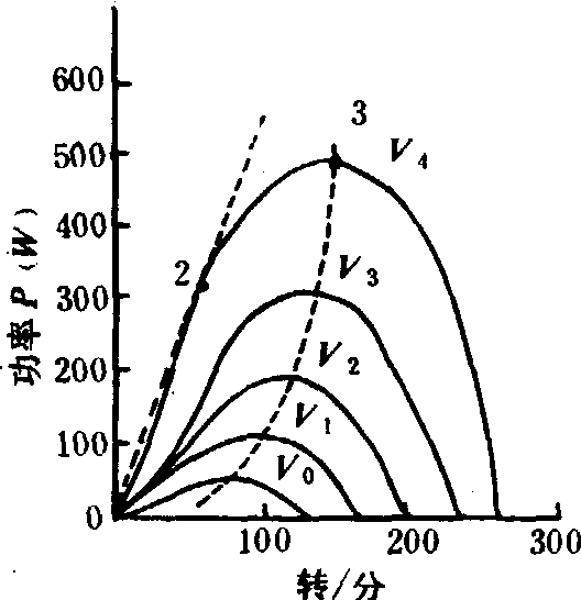 图5 不同风速时,风力机的扭矩特性曲线 由图可知:❶最大功率随风速增加而增加,如图5上的虚线3所示。 ❷最大扭矩随风速增加而增加,如图6上的虚线2所示。 ❸同一风速下风机最大扭矩时的风翼转速将低于最大功率时风翼的转速, 如图5上风速为v4时的3点和2点。2点为最大扭矩的点, 即此曲线上所得最大斜率的点。功率、扭矩和转速之间将有如下的关系: