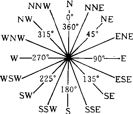 风向16方位 风向风的来向。常以16个方位和静风表示,以拉丁文缩写字母表示,即北(N)、北东北(NNE)、东北(NE)、东东北(ENE)、东(E)、东东南(ESE)、东南(SE)、南东南(SSE)、南(S)、南西南(SSW)、西南(SW)、西西南(WSW)、西(W)、西西北(WNW)、西北(NW)、北西北(NNW)。静风(C,风速<0.3 m/s,风向标不动)。按16个方向记: 风向风的来向。常用16个方位,8个方位或角度表示。风向的变化显示了气流运动的特征。有时是天气变化的先兆。 风向风的来向。常以8或16个方位或用度数(0°~360°)表示,习惯上常以风向来称呼风的名称。因地形或气压系统等的影响而改变。风向变化常显示大气运动的特征,有时且为天气变化的先兆。空中的风向是通过施放测风气球,尔后利用经纬仪或雷达探测其方位角和仰角的变化,再经过计算得出。 风向 风向全省各地的风向,具有明显的季节变化。冬季盛行偏北风,夏季盛行南风,春、秋二季为冬夏季风交替时期,风向变化较大,但以偏北风的频率最大。一地的最多风向与山脉、河流的走向有密切的关系,就全年来看,洞庭湖多北风和东北风,岳阳北风频率占24%,东北风频率占27%。溯澧水而上,风向多偏东风(大庸东风频率占24%); 溯沅水而上,沅陵、芷江多东北风 (沅陵占32%,芷江占31%); 溯湘江而上,长沙多西北风(频率为35%),衡阳、永州多东北风 (衡阳频率为25%,永州为31%); 沿资水而上,在安化多北风(频率占20%),邵阳多东北风(频度为19%)。郴州一地多北风(频率为24%)。 ☚ 气压 气象灾害 ☛ 风向 风向风吹来的方向。表示风向最基本的一个指标是风向频率,分8个或16个方位,以一定时期 (年、季、月) 内某一风向发生的次数占该时期各风向的总次数的百分比表示。 ☚ 日照时数 风速 ☛ 风向 风向风的来向。人们常以风吹来的风向来称呼风的名称,如北风、南风等。风向是经常变动的,气象观测中常以十分钟内的平均风向作为实测风向。通常用风向器测得,共分16个方位,以拉丁文缩写字母记录。如下表: