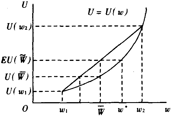 ),或者使期望效用EU(W)=U(W)。 代表w1和w2的加权平均值。效用函数U=U(w)满足:d2U/dw2>0 W*- 可以度量风险爱好的程度。 风险爱好假设有助于分析赌徒的行为。〖参〗风险厌恶 风险中性 预期效用函数 ☚ 风险中性 阿罗-普拉特(绝对)风险回避测度 ☛ |