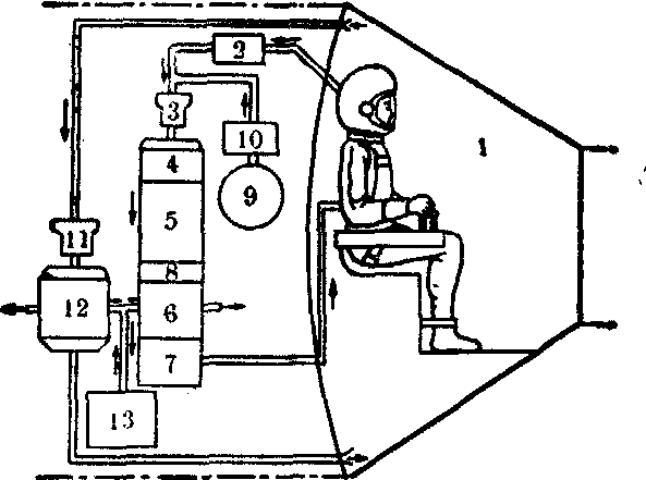 图1 早期载人飞船生命保证系统示意图 1.密封船舱 2.杂质净除器 3.通风机 4.臭味吸收器 5.CO2净化器 6.热交换器 7.水分离器 8.滤器 9.氧气瓶 10.减压器 11.通风机 12.热交换器 13.冷凝水 大气控制系统 大气控制系统能按乘员生理-心理要求调节舱内气体环境温度、湿度和压力,控制大气成分,净除二氧化碳和微量污染物。并向船舱供氧或者氧-氮(或其它稀释气体)混合气以补偿乘员的代谢和船舱泄漏消耗。 大气温度控制 载人飞船在航行过程中,可遇到极为严峻的高温环境。热负荷主要来源于人的代谢产热、舱内设备产热以及由外部传入座舱的热量。后者包括吸收太阳和其它天体的辐射热以及再入大气层时传入船舱的气动力热等。船舱大气温控系统主要以散热方式保持舱内适宜温度环境。由于热负荷变动范围较大,温控系统须具有足够散热和调节能力。温控系统分“被动式”、“半被动式”和“主动式”三种。“被动式”不含有流体或运动部件。含有流体或运动部件,且热沉温度低于热源温度的系统称“半被动式温控系统”。若系统使用热泵,且散热温度高于热源温度则称“主动式温控系统”。飞船船舱外部的涂层及其它被动温控技术通常不属于生命保证系统研究的范畴。船舱大气温控系统主要采用半被动式温控技术,利用消耗性液体(通常是水)的蒸发潜热和宇宙真空环境,以控制蒸发压力的方法控制舱内气温。采用水蒸发散热器(或水升华式散热器)的方法只适于短期飞行计划。美国的水星载人飞船曾采用。随飞行时间延长和乘员人数增多,消耗性水蒸发散热技术只能作为辅助性的温控手段,主要采用流体泵压循环温控系统,传热流体通过热交换器把舱内气体的热量带到空间辐射散热器散向宇宙空间。今后应用热管温控技术,系统重量将减轻。