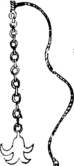 ☚ 飞枪 飞 ☛ 飞钩 飞钩古代稀有兵器的一种。纯铁制成,形状象鸱鸮的脚,故又叫铁鸱脚。钩锋长利,四刃曲贯铁索,用长麻绳系缚铁索的端环。此种兵器具有钩、掬、带、搂、取等作用。掷钩于稠人之中,每钩可取二人。图为明代制造的飞钩(图71)。