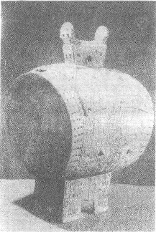 商。乐器。通高75.5厘米,上长49厘米,下长39厘米,鼓面竖径39.5厘米,横径38厘米。重约42.5公斤。1977年湖北省崇阳县汪家咀出土。湖北省博物馆藏。此鼓身为横置筩形。两侧饰云雷纹和乳钉纹。鼓面为椭圆形,素面,边缘饰三周乳钉纹。鼓身上部正中立有一枕形部件,类似器物盖钮。鼓身下部正中有方形圈足,作为鼓座底托,纹饰与鼓身相同。此器从造型、纹饰来看,具有商代晚期至西周早期之物的特征,是国内保存的唯一的商至西周早期的铜鼓。此鼓的出土,也是研究我国古代青铜艺术和奴隶社会礼乐制度珍贵的实物资料。《帝王世纪》载:“黄帝杀夔,以皮为鼓,声闻五有。”知鼓最早当为革制。商墓中曾发现过框与皮已朽的鼓。铜鼓在先秦很少见,商代目前也仅见两例,一面早年流失国外,一面就是崇阳铜鼓。